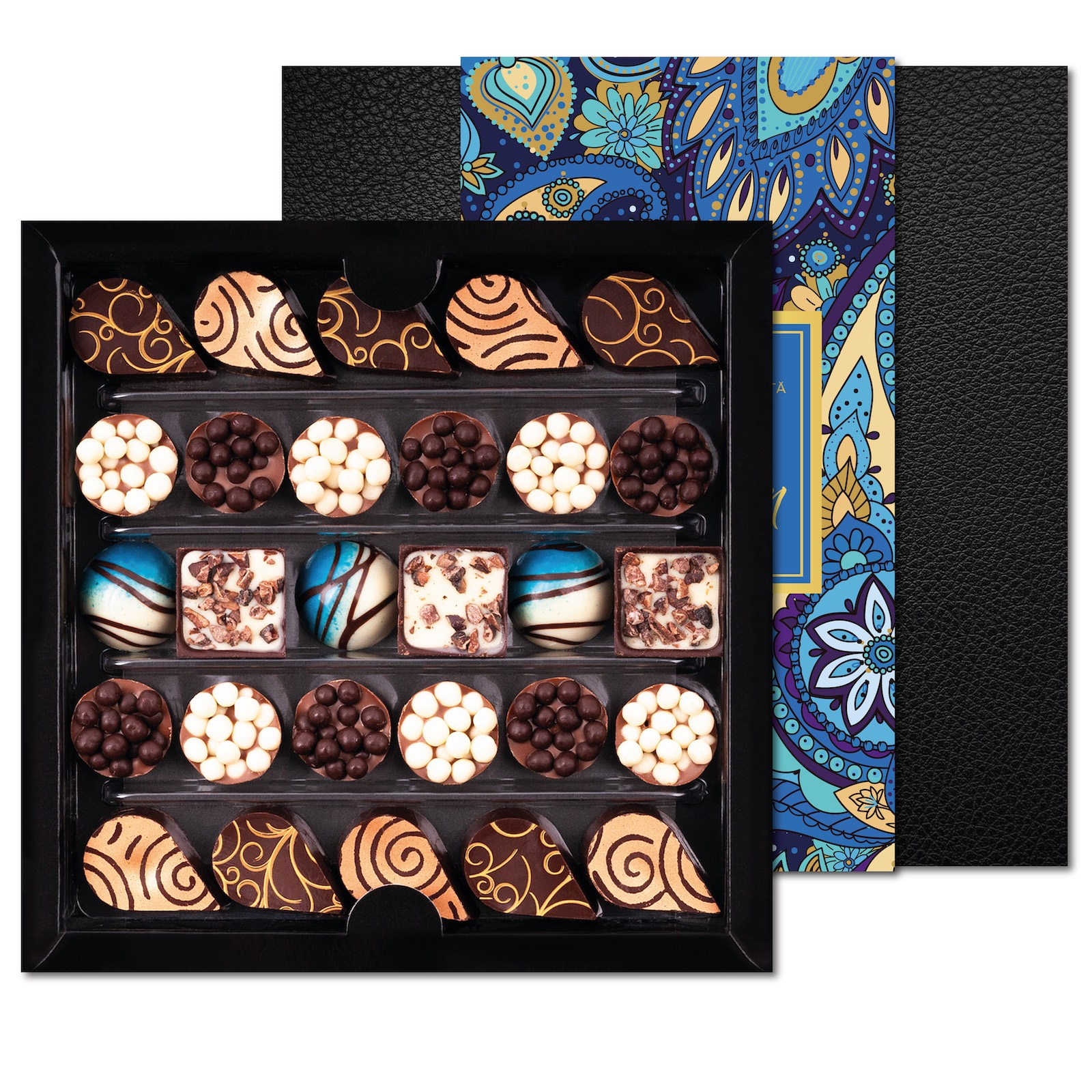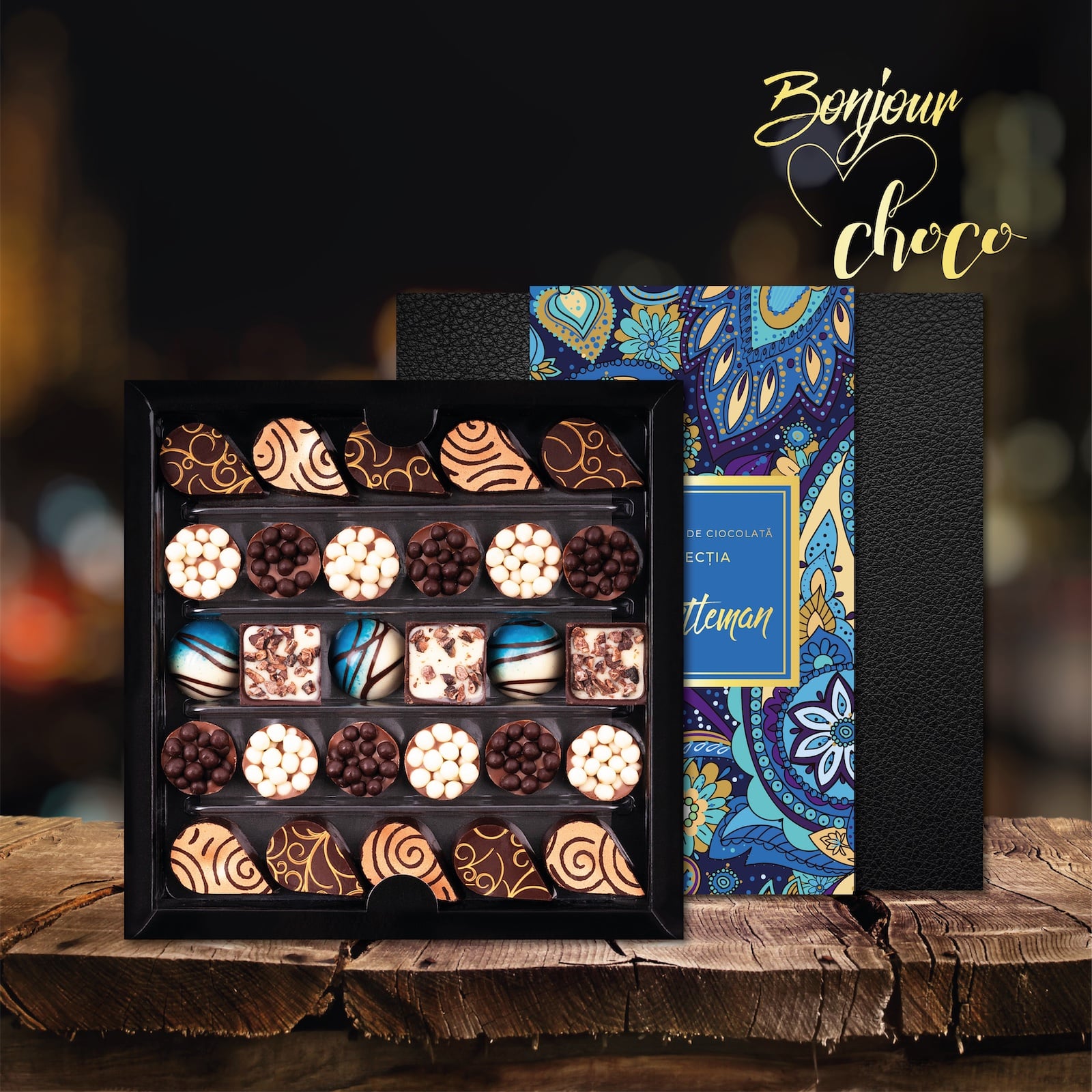 O compoziție cu 28 de bomboane de ciocolată, care va încânta orice gentleman: bomboane de ciocolată neagră cu umplutură de whisky, cognac sau rom, însoțite de aroma inconfundabilă gianduja cu perle de ciocolată albă și neagră. Un cadou minunat sau un moment memorabil de răsfăț personal.