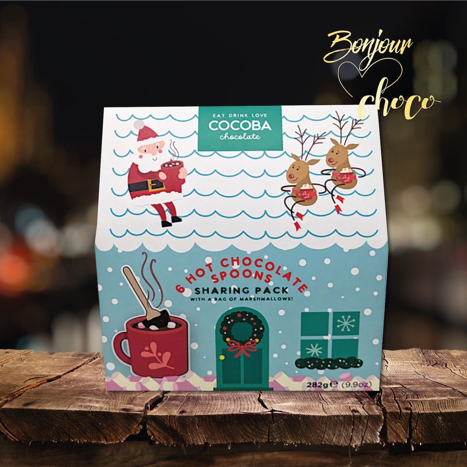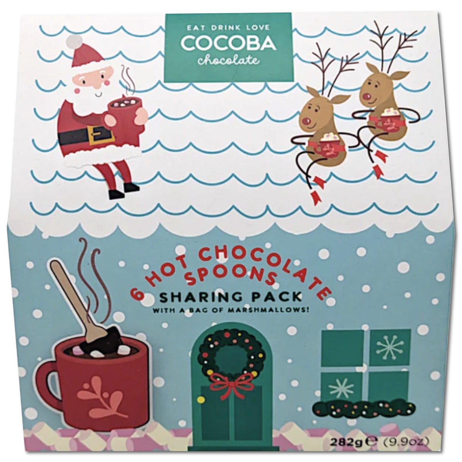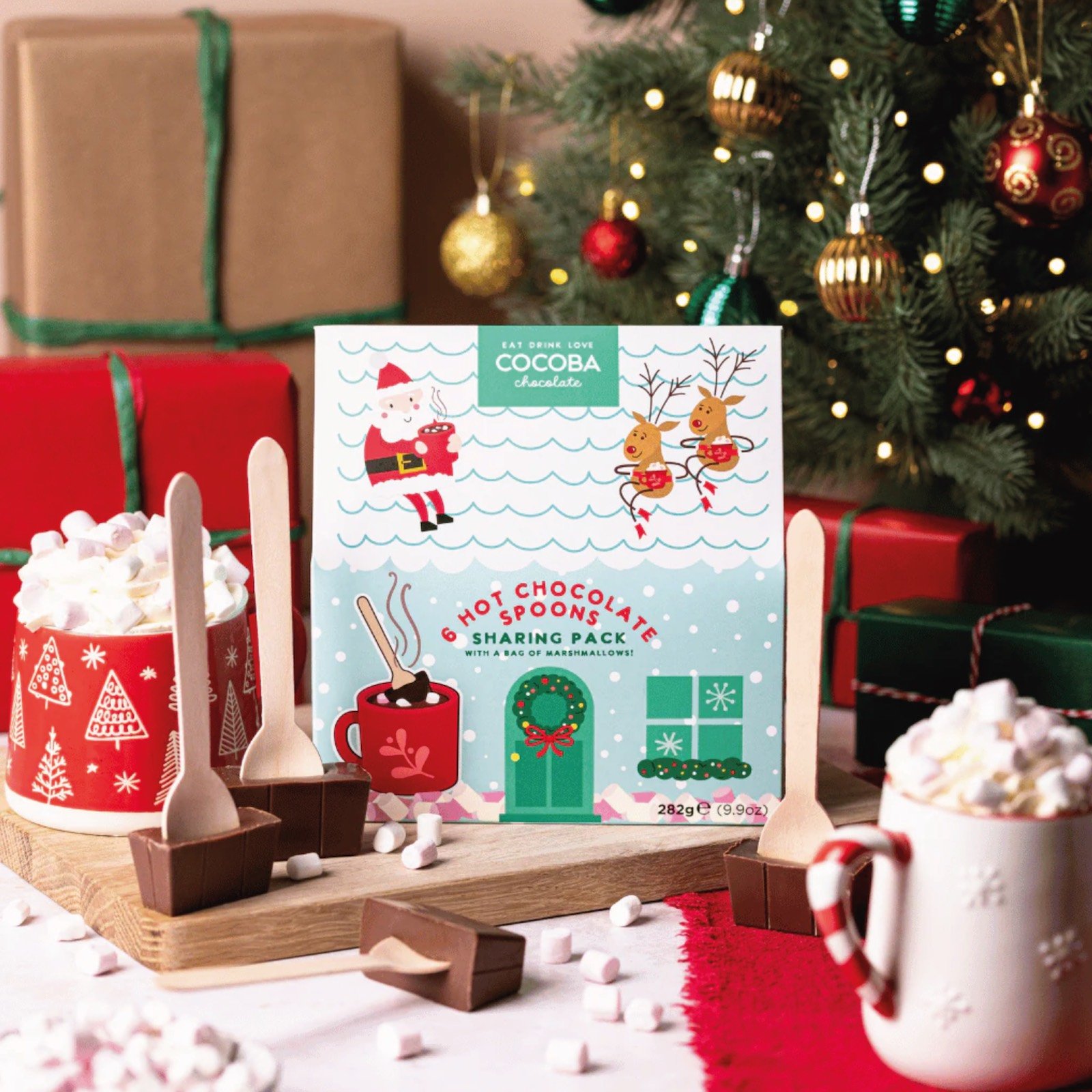 O căsuță încântătoare cu un set de linguri de ciocolată cu lapte pentru ciocolată caldă. Două blocuri de ciocolată pentru adulți și patru pentru copii, împreună cu o pungă de bezele pufoase, perfecte pentru a strânge familia în jurul bradului. Ce poate fi mai bun decât o ciocolată caldă în așteptarea lui Moș Crăciun?