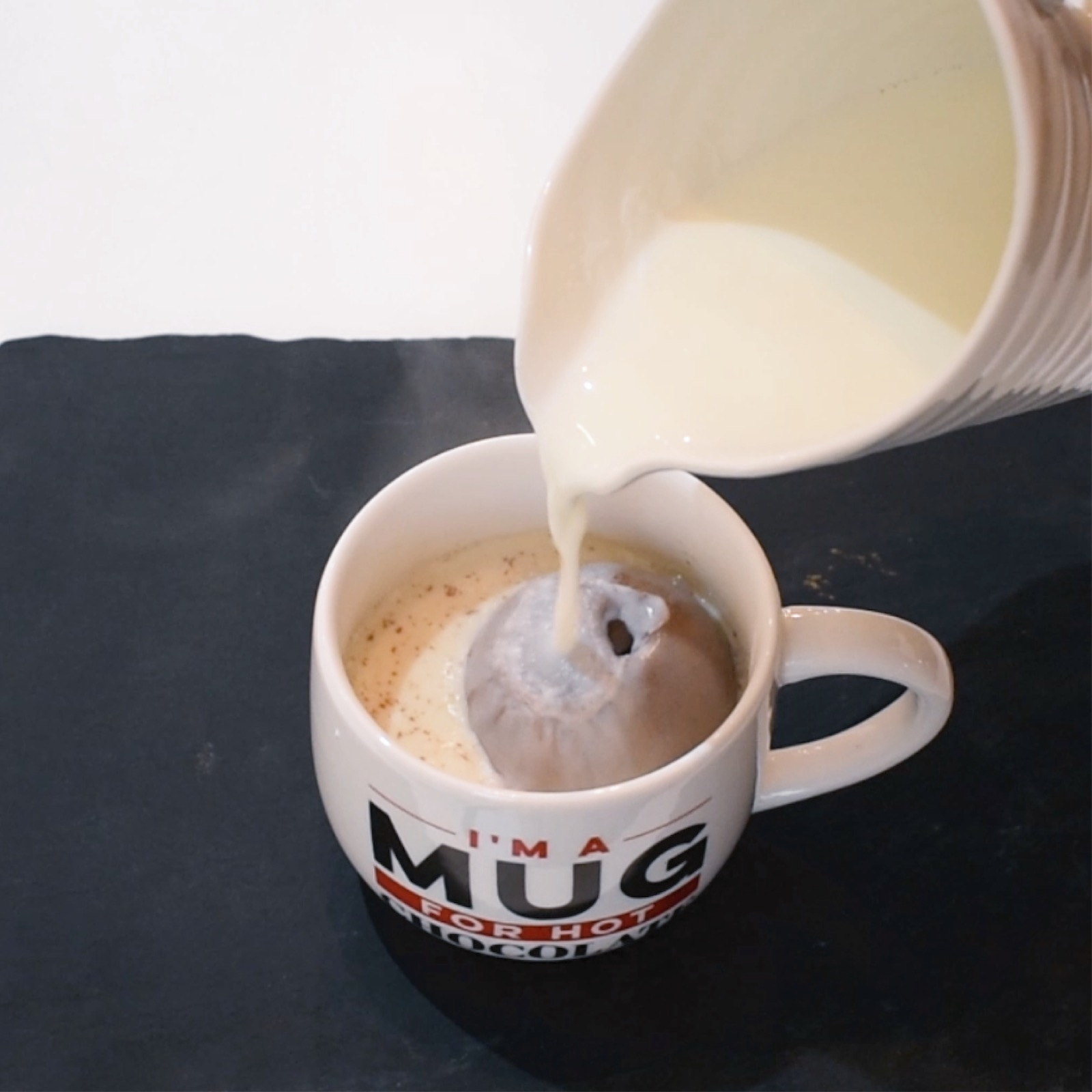 Introduceți bombița de ciocolată în cana preferată și turnați lapte fierbinte peste ea. Ușor, ușor, să nu se supere bezelele. Amestecați încet până se topește ciocolata și apar bezelele din interior. Laptele se va transforma într-o ciocolată caldă aromată și ultra-cremoasă, iar bezelele se vor ridica la suprafață pentru un efect încântător. Dacă doriți, puteți presăra deasupra câțiva fulgi de ciocolată belgiană și veți obține un produs numai bun de pus pe Instagram. #bonjourchoco #ciocolatacalda #rasfat