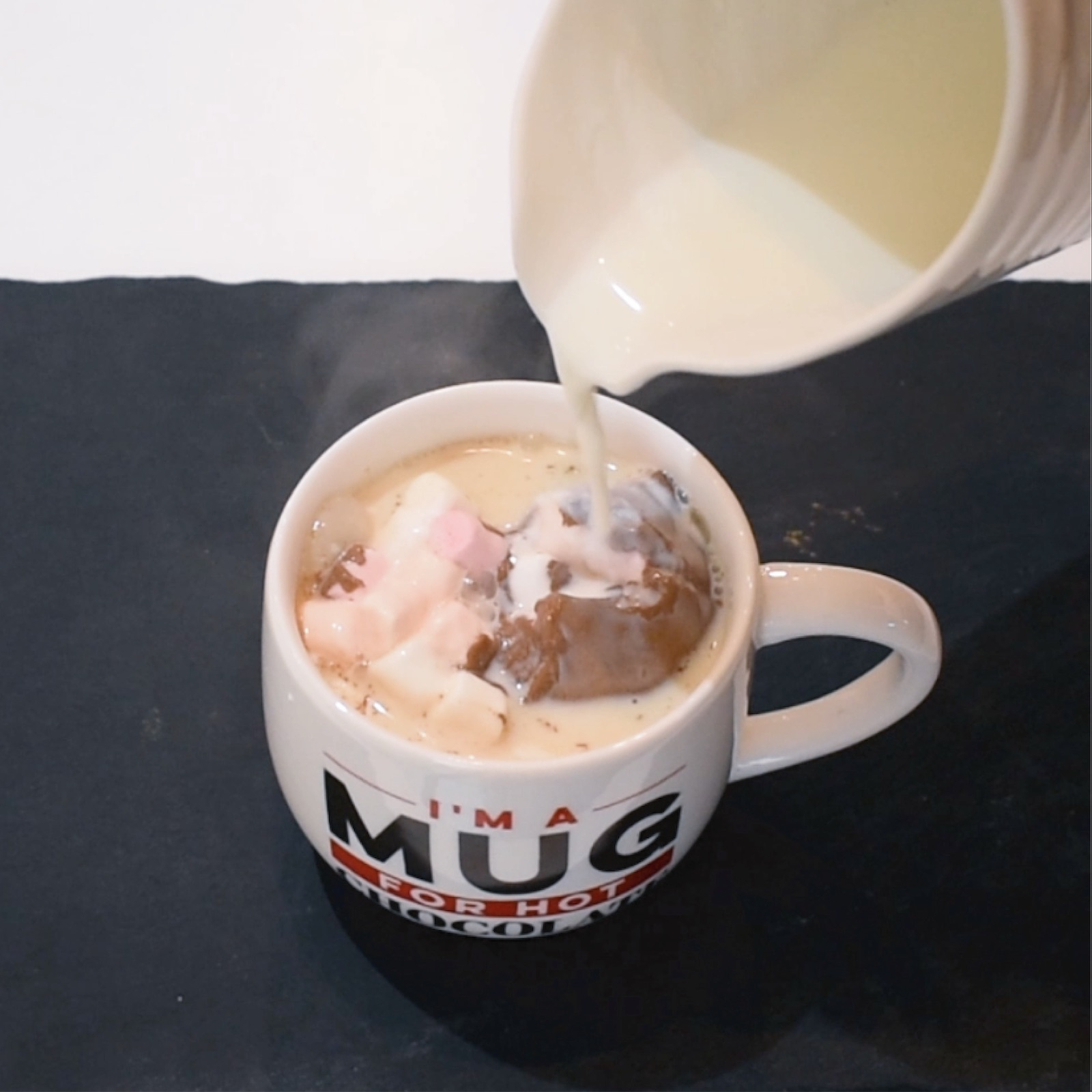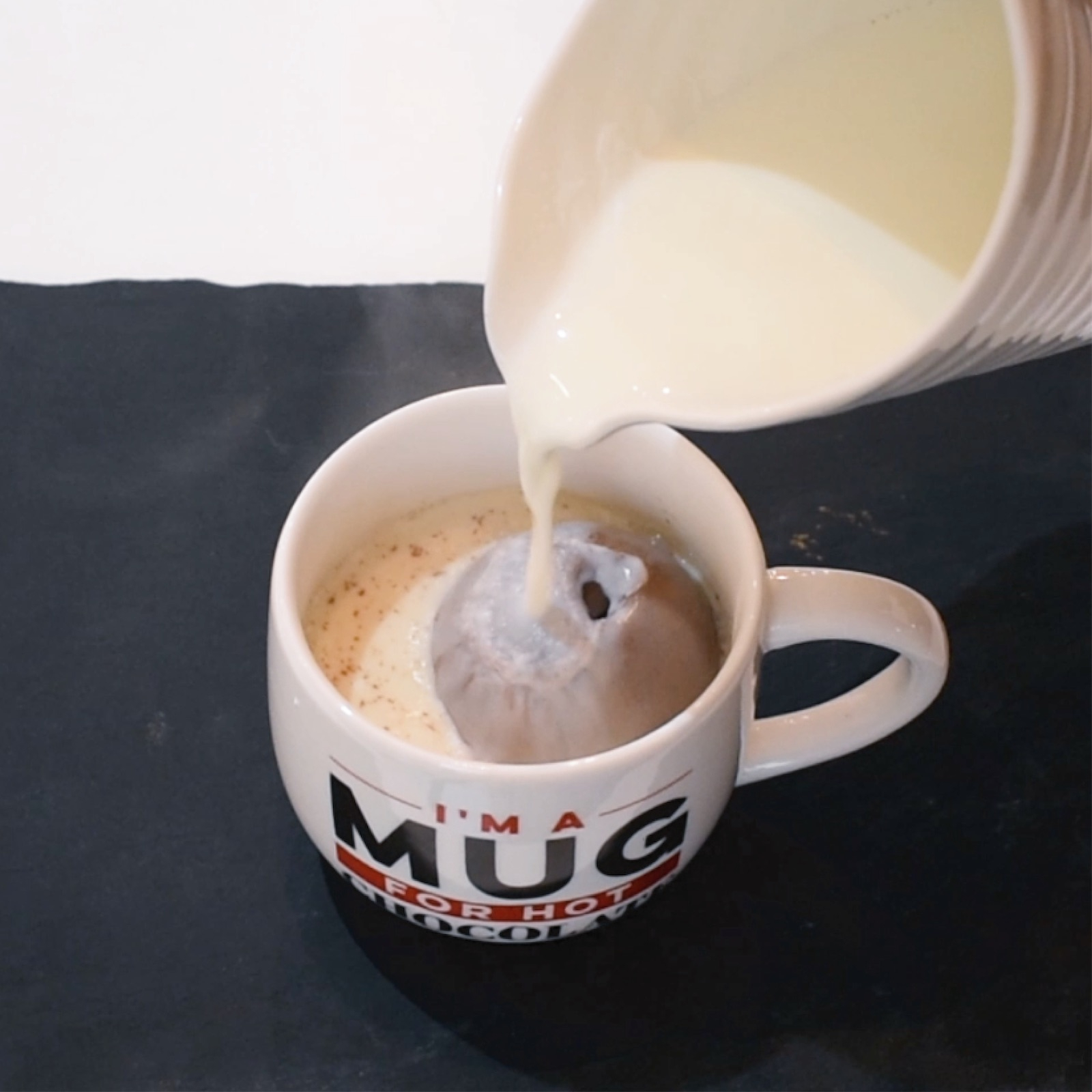 Introduceți sfera de ciocolată în cana preferată și turnați lapte fierbinte peste ea. Ușor, ușor, să nu se supere bezelele. Amestecați încet până se topește ciocolata și apar bezelele din interior. Laptele se va transforma într-o ciocolată caldă aromată și ultra-cremoasă, iar bezelele se vor ridica la suprafață pentru un efect încântător. Dacă doriți, puteți presăra deasupra câțiva fulgi de ciocolată belgiană și veți obține un produs numai bun de pus pe Instagram. #bonjourchoco #ciocolatacalda #bucuriacopiilor #rasfat #searadeiarna