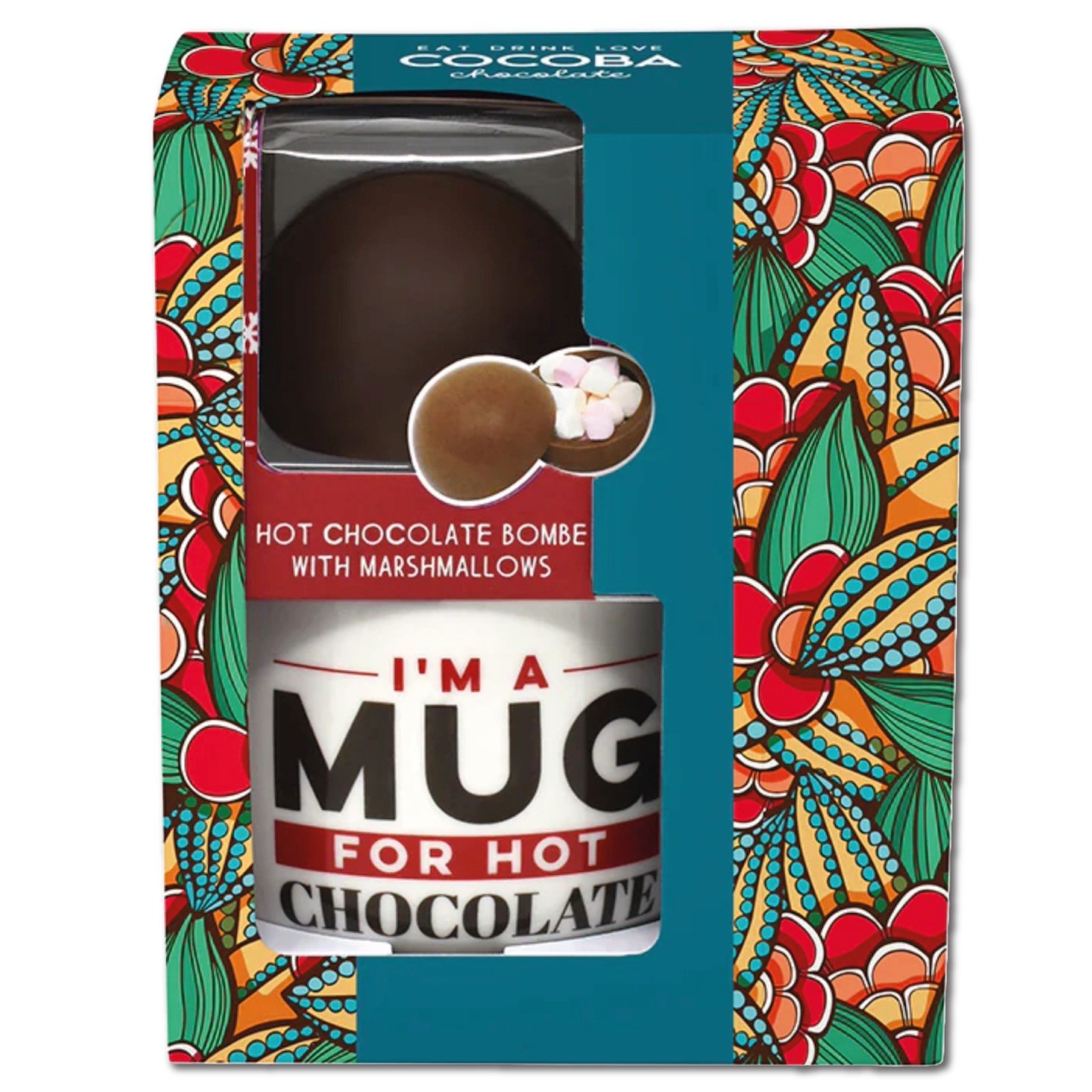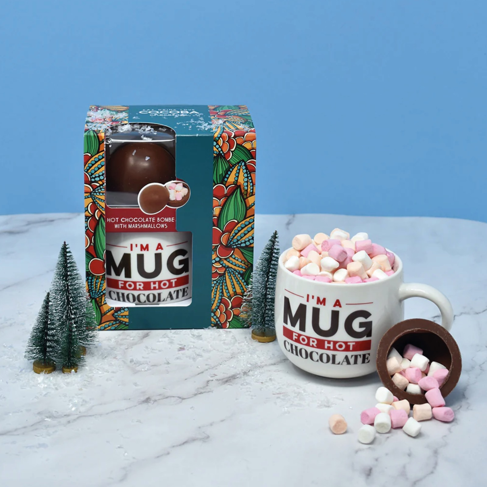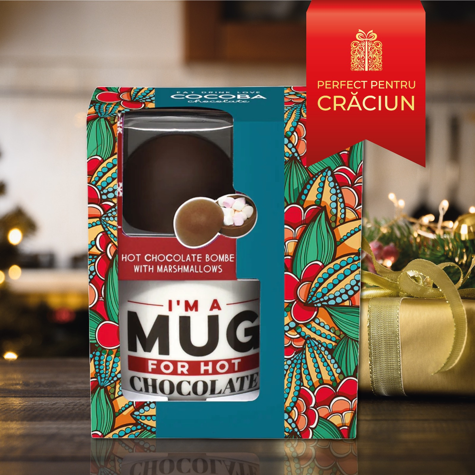 Set cadou format dintr-o sfera de ciocolată belgiană cu lapte, ediție de Crăciun, și o cană specială pentru ciocolată caldă. Un cadou minunat pentru cel mic, pentru ea sau, de ce nu, pentru tine.