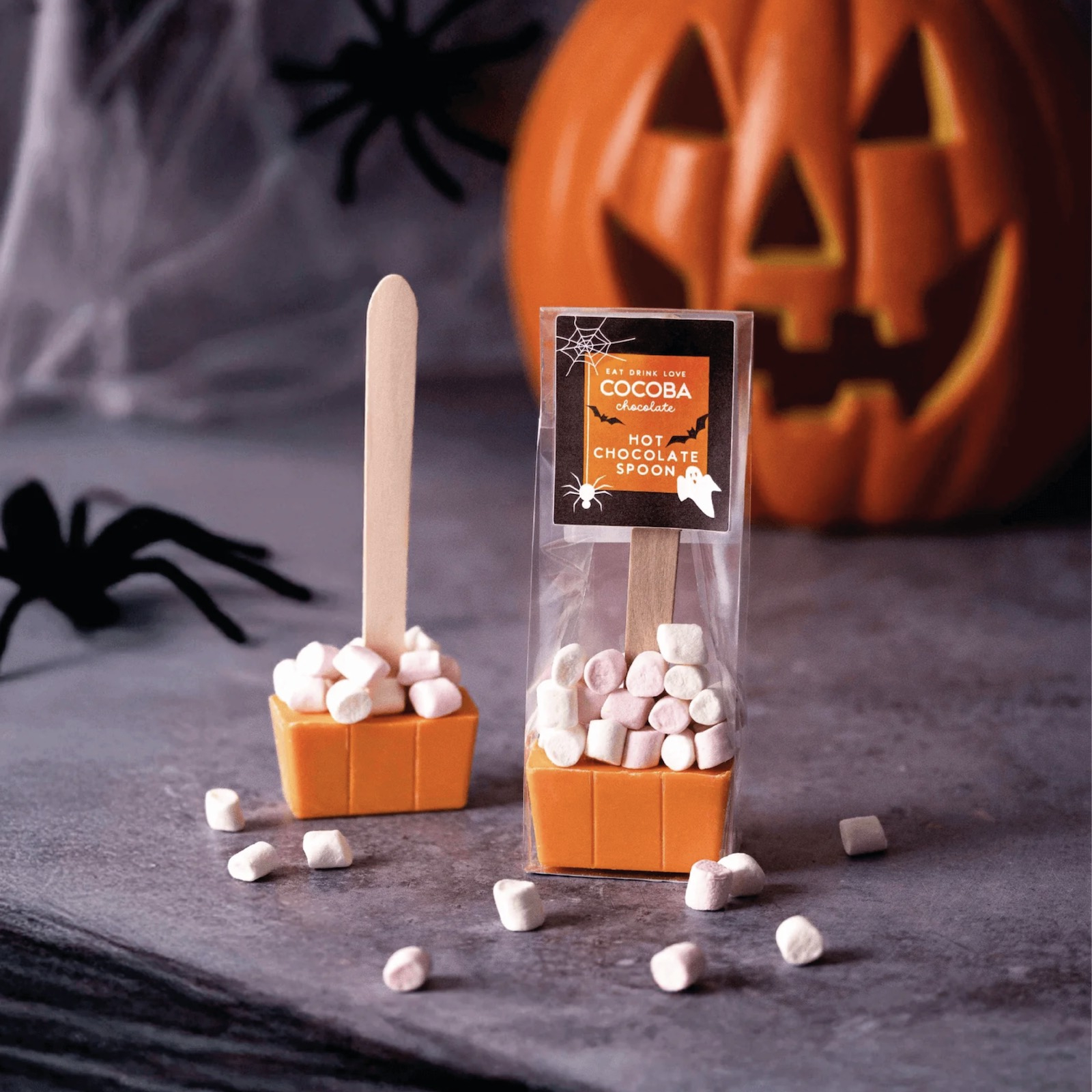 Surprinde-ți cana preferată de Halloween cu această lingură de ciocolată cu portocale și bezele. Produs handmade din ciocolată albă cu aromă delicioasă și proaspătă de portocală, acoperită cu un pumn de bezele pufoase pentru a crea deliciul perfect pentru trick-or-treat.