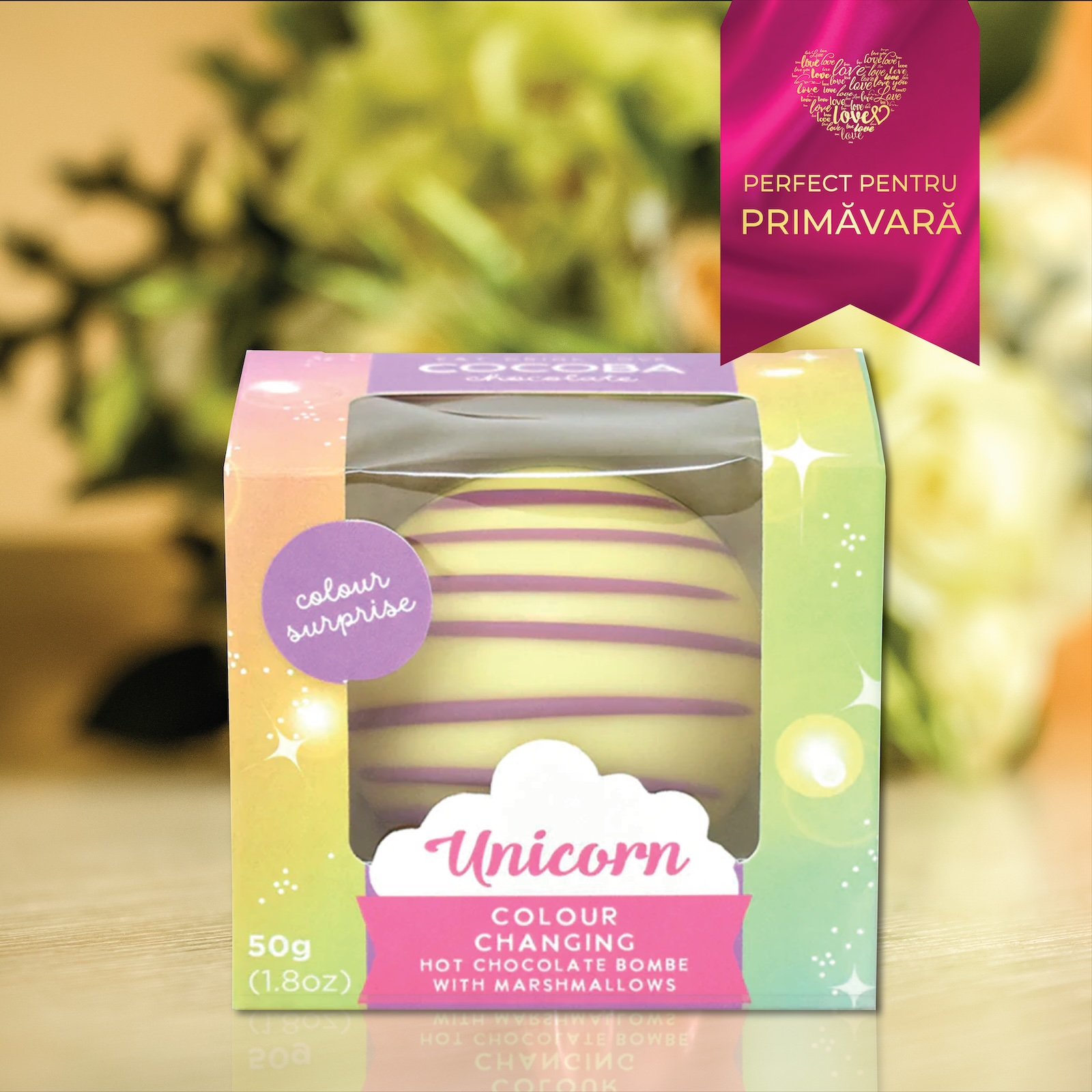 Descoperă încântătoarele sfere de ciocolată Unicorn și crează o experiență cu adevărat captivantă! Fiecare sferă de ciocolată albă conține o surpriză colorată pentru o doză suplimentară de magie, plus un pumn de bezele pufoase pentru a transforma fiecare ciocolată caldă într-un deliciu irezistibil! Aceste petale de magie albă sunt perfecte pentru a-ți încânta oaspeții la o petrecere tematică cu unicorni sau pur și simplu pentru a-i vrăji pe cei cu inima tânără.