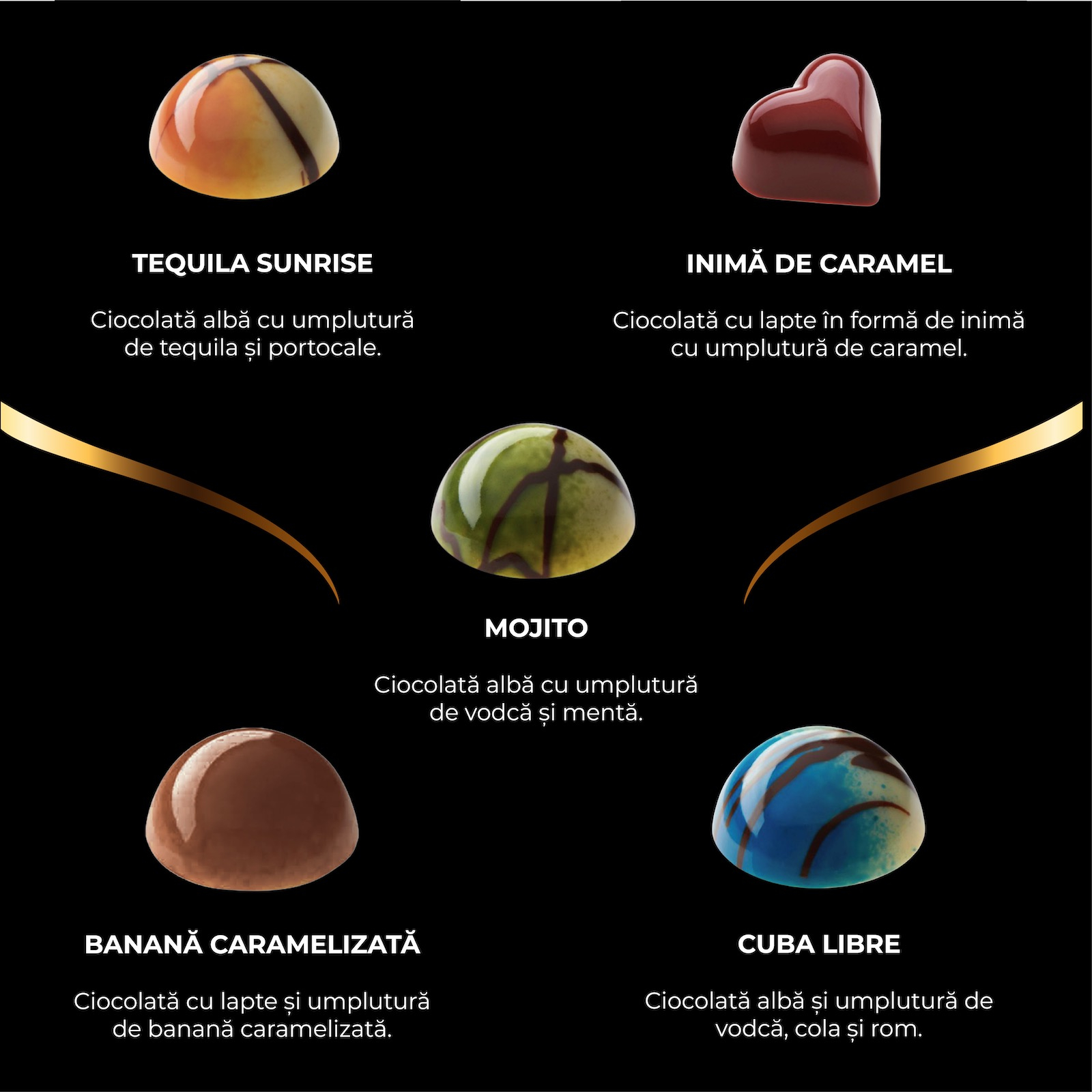 Zahăr; unt cacao; masă cacao; FRIȘCĂ; LAPTE praf integral; ALUNE DE PĂDURE; sirop glucoză; UNT; uleiuri și grăsimi vegetale (palmier, rapiță, floarea soarelui, cocos); MIGDALE; emulsifiant: glicerol; lecitină (SOIA, rapiță, floarea soarelui); stabilizator: sorbitol; alcool; făină de GRÂU; stafide; ulei de bumbac; puree de banane; sirop de zahăr invertit cristalizat; aromă naturală de vanilie; puree de mere verzi (mere verzi, sirop de zahăr invertit, regulator de aciditate: acid citric, antioxidant: acid ascorbic); puree de zmeură; boabe cacao prăjite și măcinate; zahăr candel; puree de mango; lichior Malibu; whisky; vodcă; cognac; lichior triplu sec; arome; zer pudră (LAPTE); lichior de merișoare; tequila; făină de GRÂU; cafea instant; amidon modificat (GRÂU); LAPTE praf degresat; puree de fructul pasiunii; zahăr brut din trestie de zahăr; făină de SOIA; boabe de cafea; zahăr caramelizat; agent de creștere: E500; scorțișoară; nucșoară; sare; agent glazurare: E414; lactoză (din LAPTE); proteină (din LAPTE); extract de malț (din ORZ); antioxidant: E306; extract de piper roșu; grăsimi anhidre din LAPTE; piper cayenne; coloranți: E171, E172, E102, E110, E129, E132, E124, E133, E120, E100. Pentru alergeni, consultați ingredientele scrise cu MAJUSCULE. Poate conține lapte, gluten, nuci și alte fructe cu coajă lemnoasă (alune de pădure, nuci, fistic, caju, migdale, alune, nuci pecan), ouă și produse derivate.