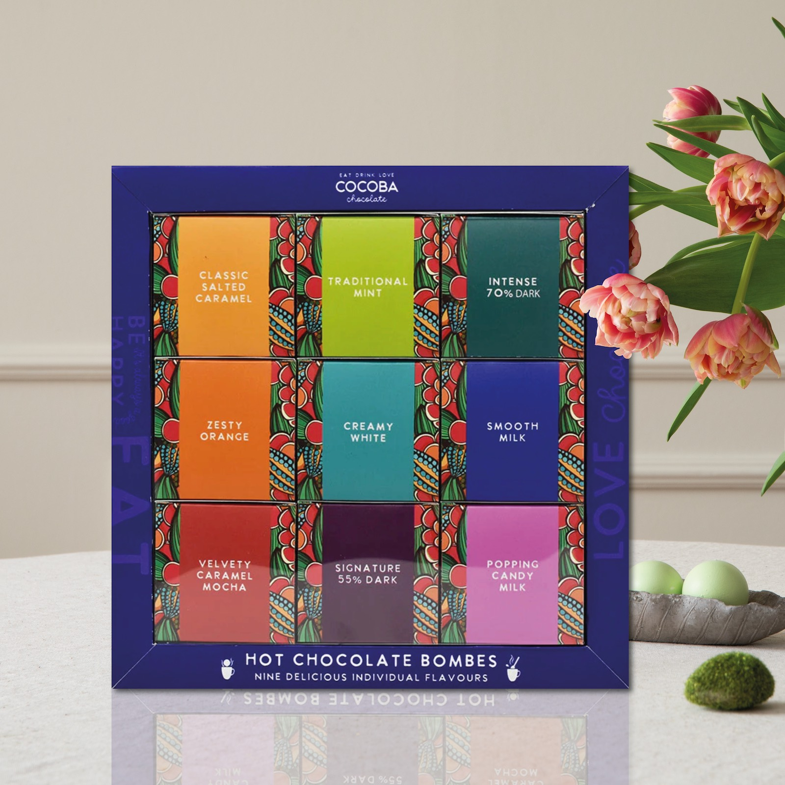 Unicul produs care include toate sortimentele de sfere de ciocolată, toate gusturile și aromele de vis imaginate de chocolatierii Casei Cocoba: ciocolată neagră cu 55% cacao, ciocolată cu lapte și portocale, ciocolată neagră cu mentă, ciocolată albă cremoasă, ciocolată belgiană cu lapte, ciocolată cu lapte și caramel mocha, ciocolată cu lapte și popping candy, ciocolată cu lapte și caramel sărat și ciocolată neagră intensă cu 70% cacao. Un cadou fabulos, arome parfumate pentru toate gusturile.
