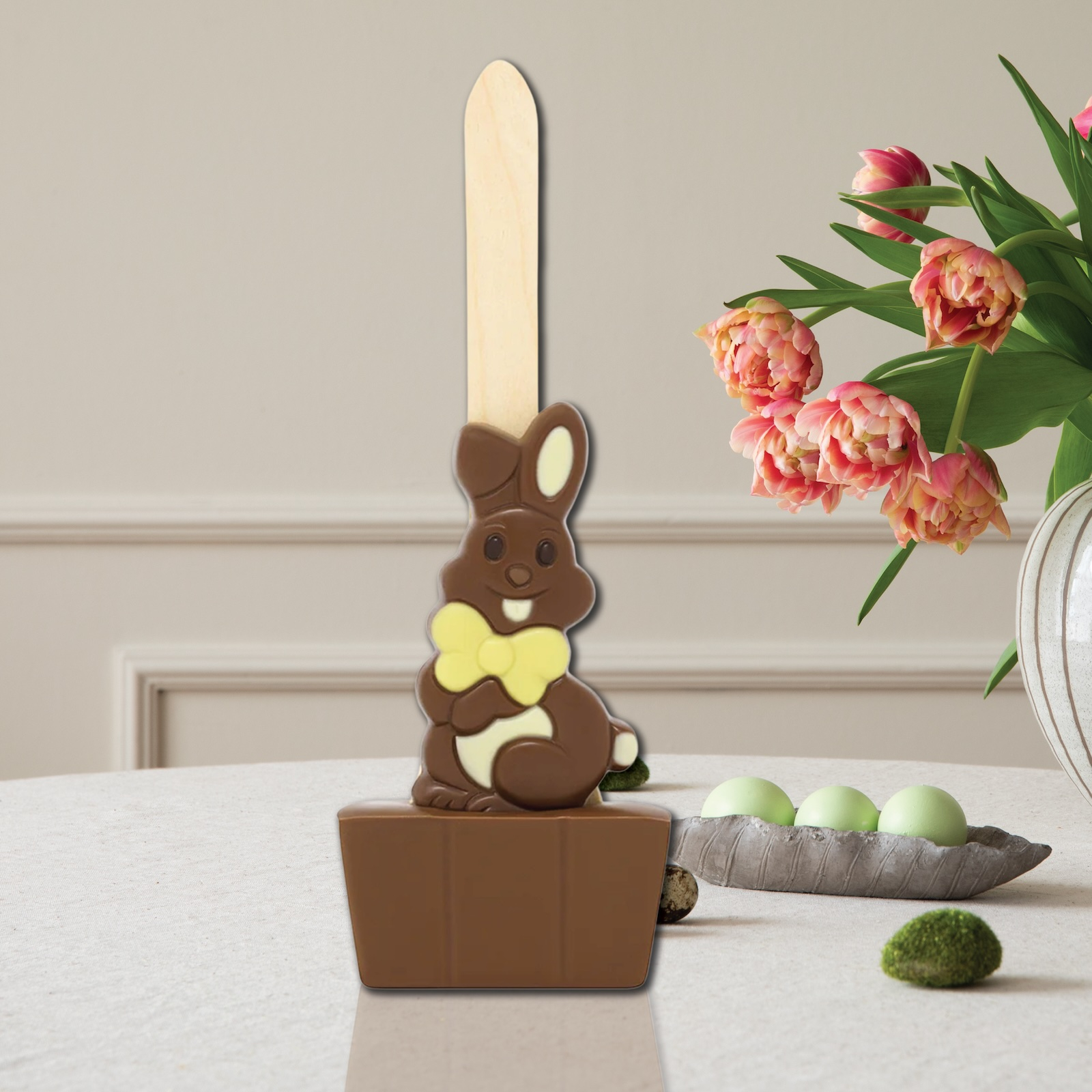 Un produs bestseller în ambalaj special de sezon! Iepurașul stă cuminte pe un bloc din cea mai fină ciocolată belgiană cu lapte, așteptând să o ia la goană la vânătoarea de ouă. O experiență încântătoare, autentică și apetisantă.
