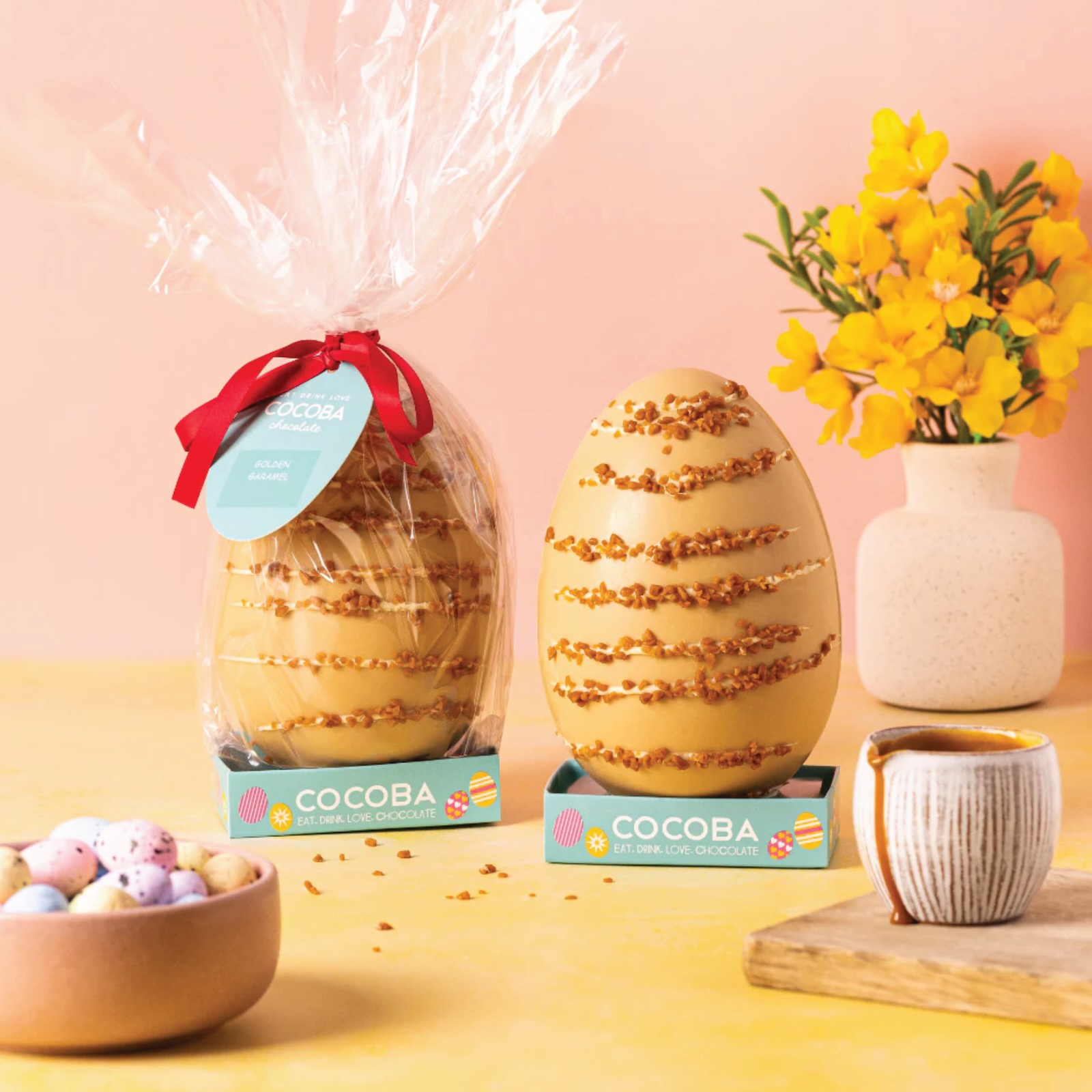 Un ou gigant, auriu și dolofan, din ciocolată belgiană albă cu caramel, glazurat cu ciocolată albă și presărat cu crănțănele de caramel pentru un plus de eleganță. Ambalat cu grijă în celofan cu fundă roșie, arată senzațional. #bonjourchoco #ciocolataculapte #oudeciocolata #rasfat