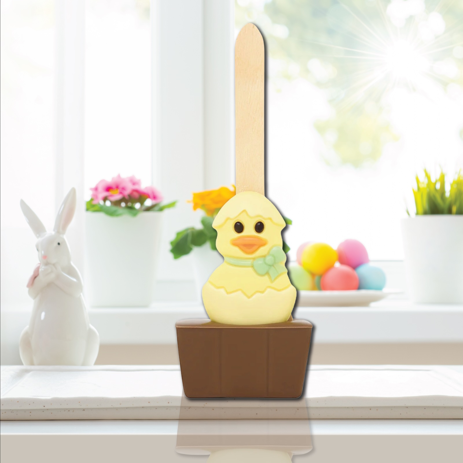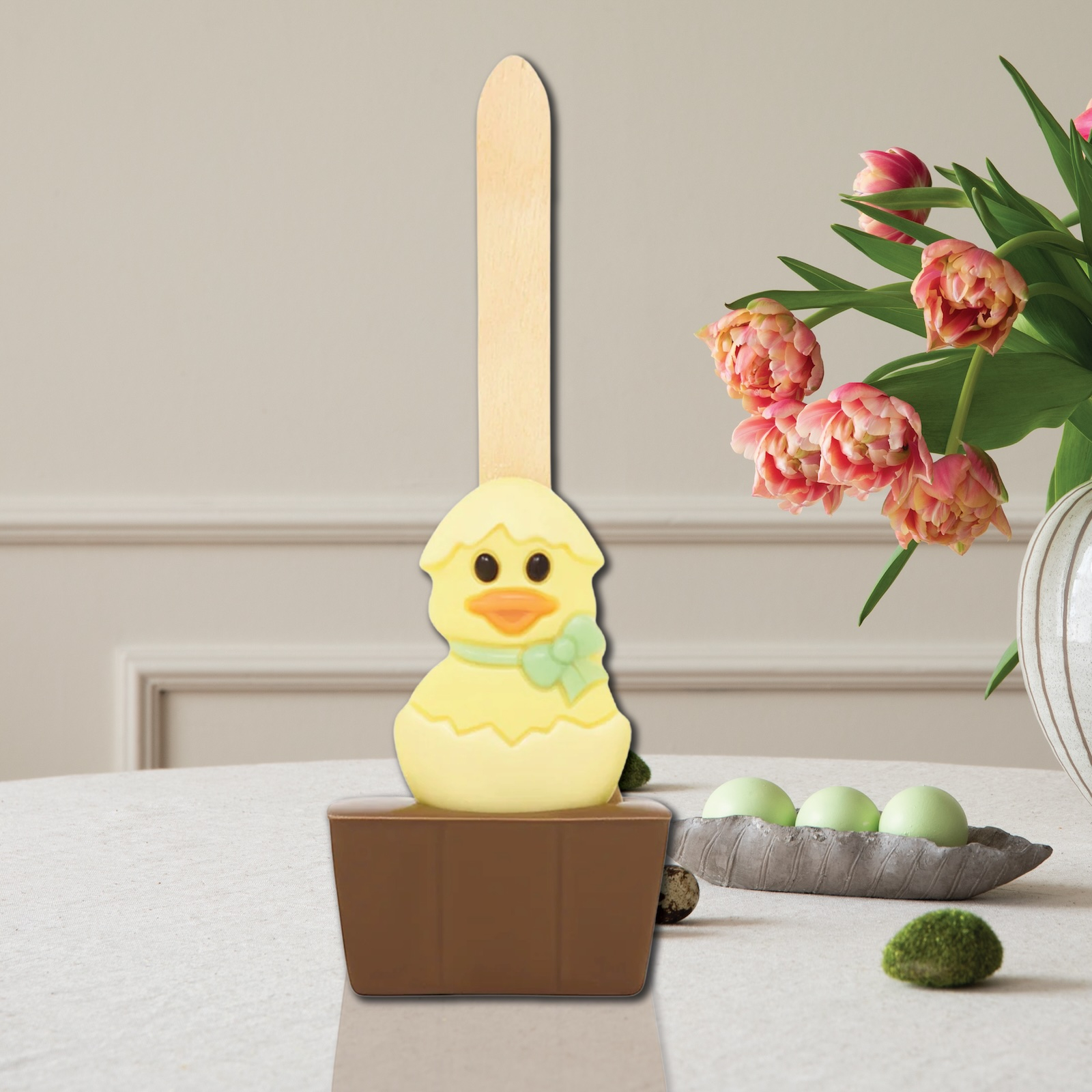 Un produs bestseller în ambalaj special de sezon! Un pui de rățușcă fermecător, proaspăt ieșit din ou, stă cuminte pe un bloc din cea mai fină ciocolată belgiană cu lapte, bucurându-se de glazura lui elegantă de ciocolată albă. O experiență încântătoare, autentică și apetisantă.