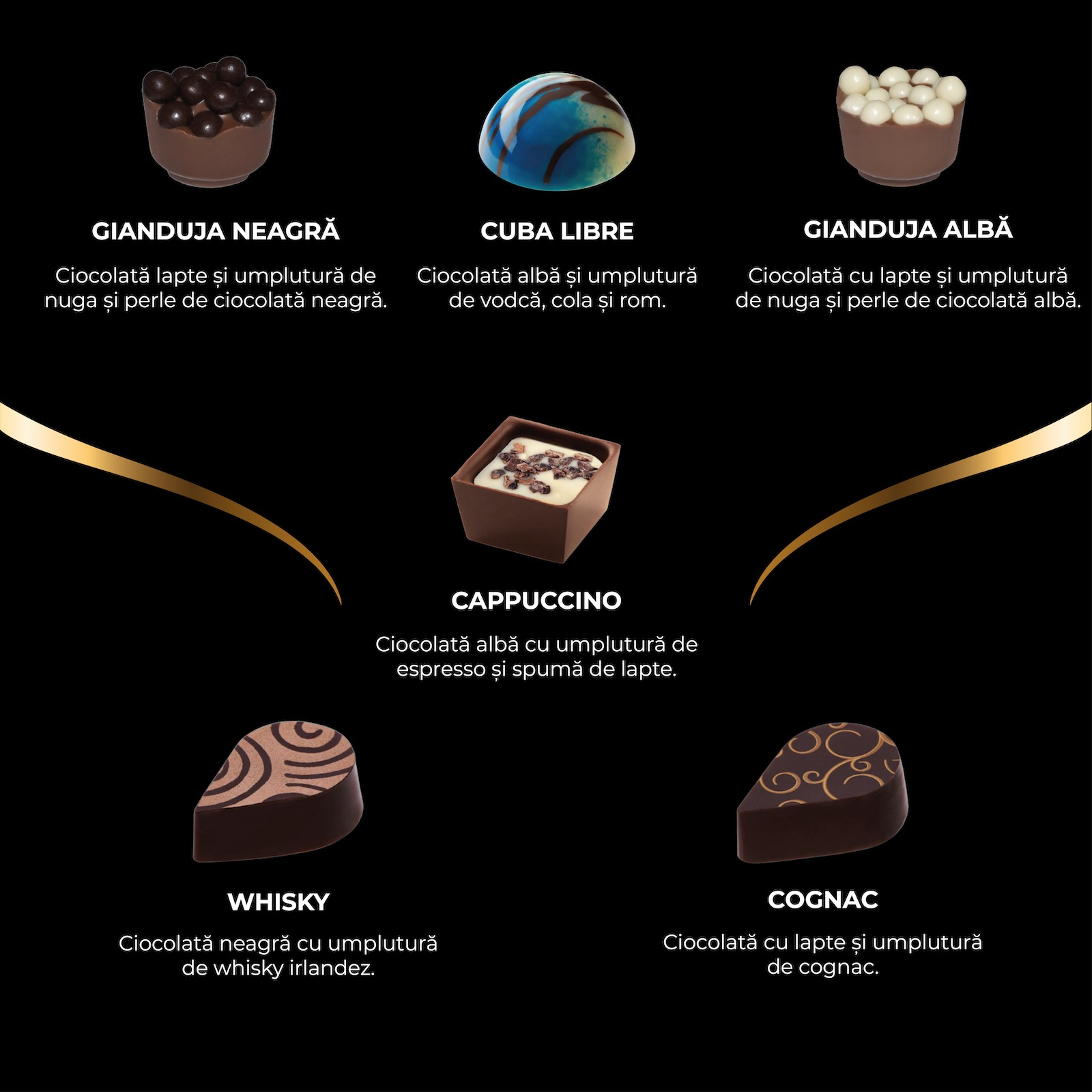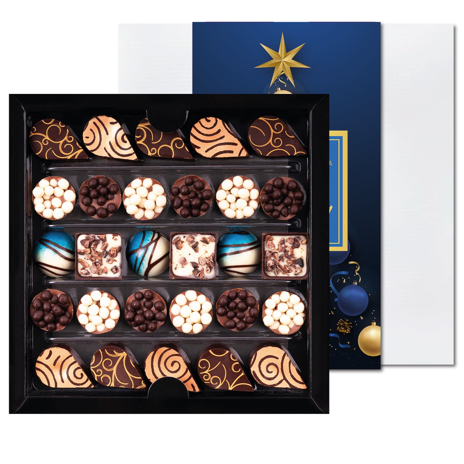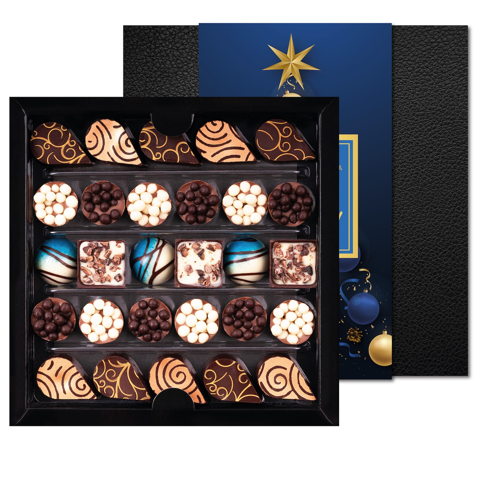 Acum în ambalaj special de Crăciun! O compoziție cu 28 de bomboane de ciocolată, care va încânta orice gentleman: bomboane de ciocolată neagră cu umplutură de whisky, cognac sau rom, însoțite de aroma inconfundabilă gianduja cu perle de ciocolată albă și neagră. Un cadou minunat sau un moment memorabil de răsfăț personal.