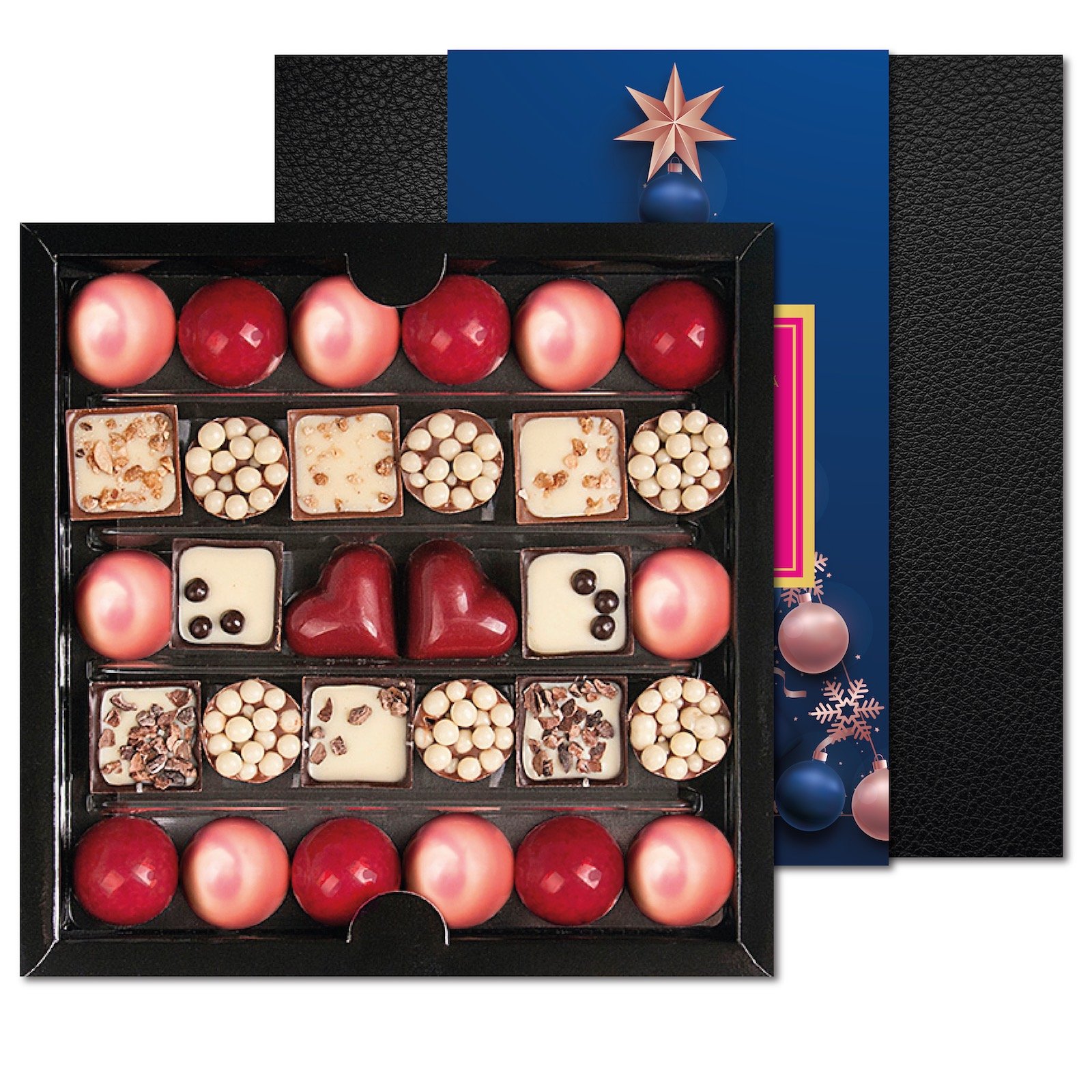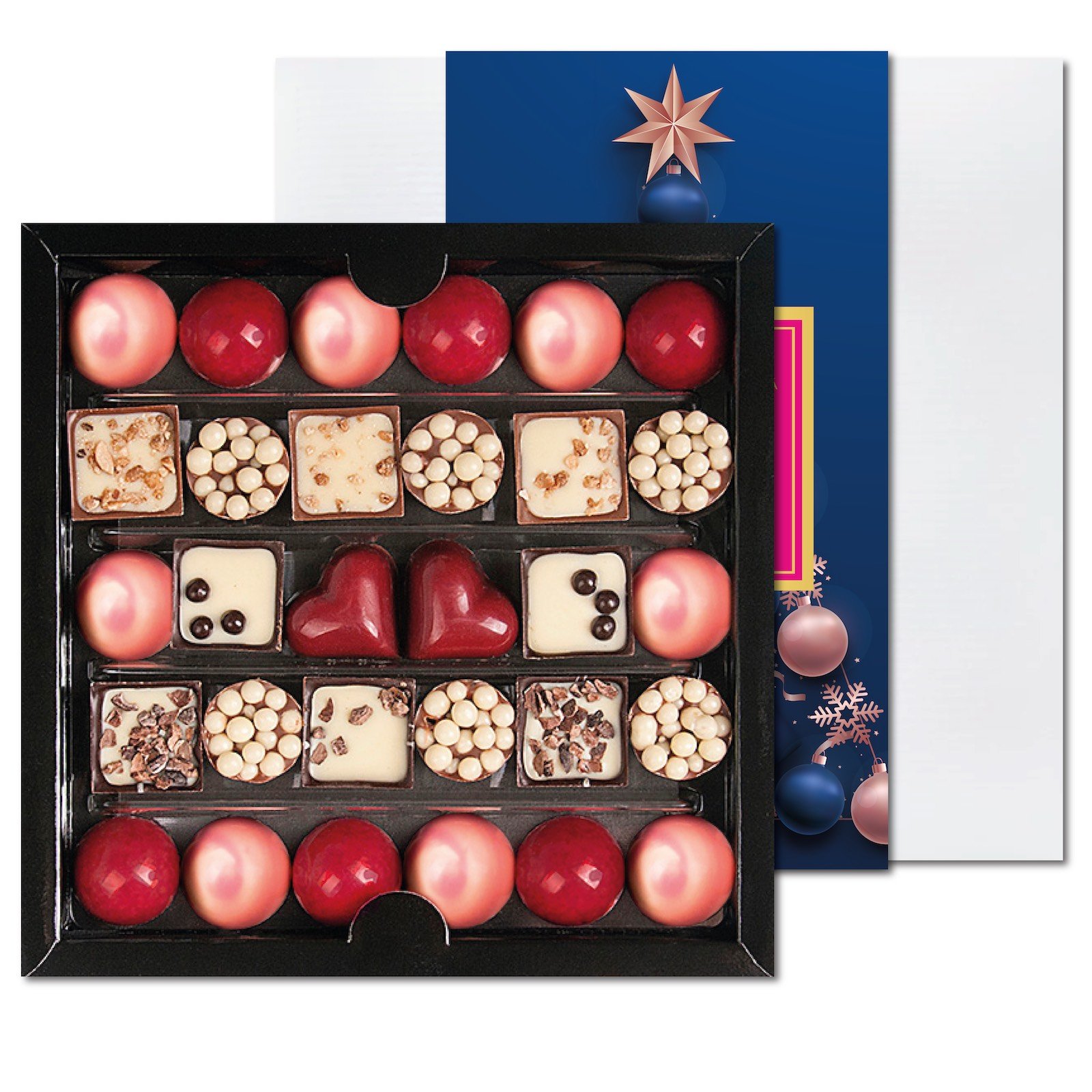 Acum în ambalaj special de Crăciun! Inimi de caramel, zmeură caramelizată, ciocolată ruby cu umplutură de alune de pădure și ceșcuțe de ciocolată umplute cu cappuccino, amaretto și fursecuri. Cea mai frumoasă și delicată modalitate de a onora o lady.