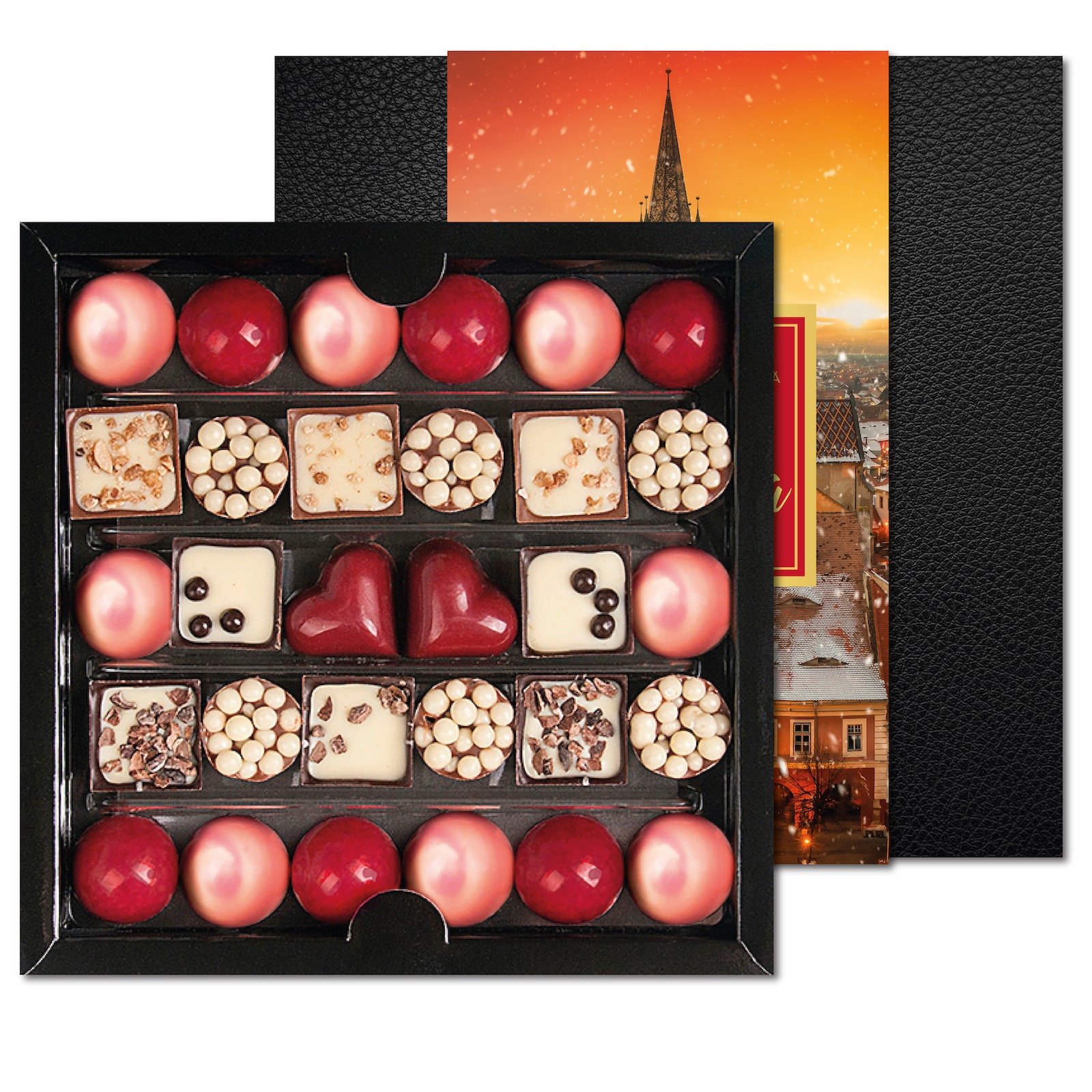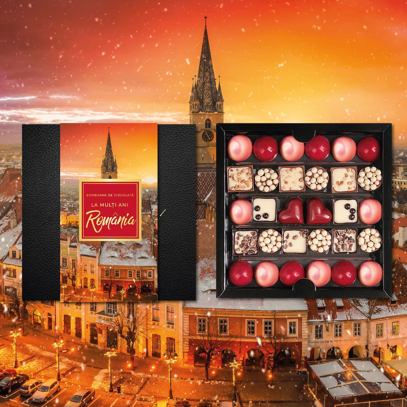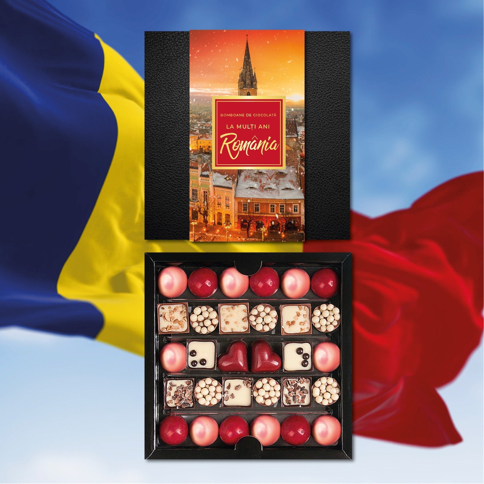 Sărbătorim Ziua Națională a României cu șase cutii de bomboane îmbrăcate festiv! Inimi de caramel, zmeură caramelizată, ciocolată ruby cu umplutură de alune de pădure și ceșcuțe de ciocolată umplute cu cappuccino, amaretto și fursecuri. Cea mai frumoasă și delicată modalitate de a onora o lady.